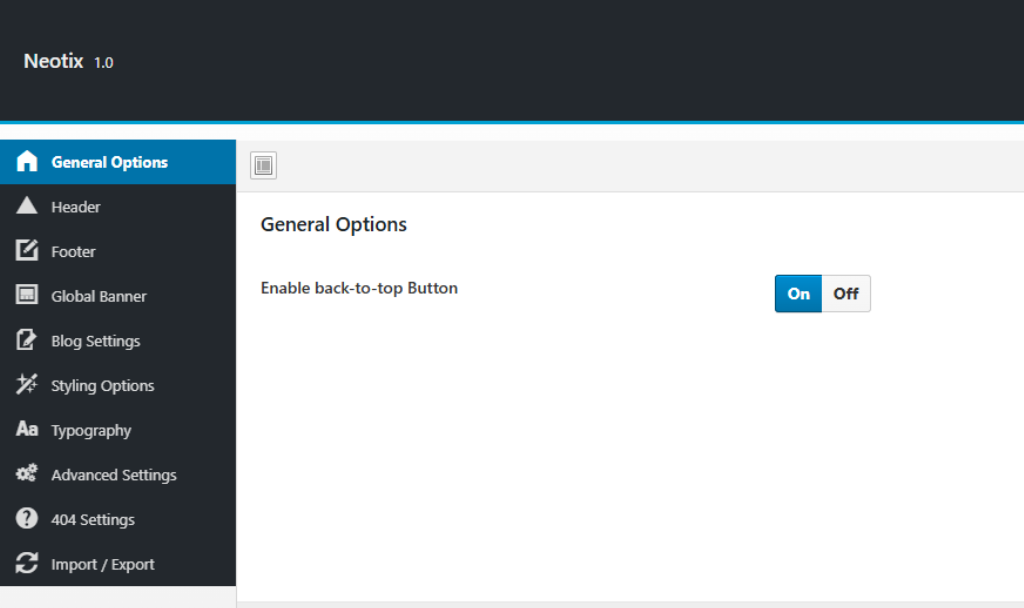 The Neotix theme includes a powerful and easy-to-use Theme Options panel that allows you to customize the appearance and functionality of your website without touching any code.
